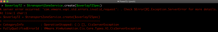 I normally use PowerCLI for my Automation work and/or for prototyping purposes, not only is it easy to do but PowerCLI is still one of the most popular tool used by our customers and it means that they can easily benefit from my work. However, one of my pet peeves when working with the NSX-T APIs and PowerCLI is simply the lack of useful error messages. Here is the generic error message that you would normally see even checking the $Error[0].Exception.ServerError variable, it generally does not contain anything useful or actionable.