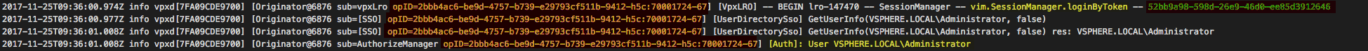 I would also recommend searching from the bottom up as you may want the last login from this particular user. Once you have identified the line, you then need to go up three lines until you see "vim.SessionManager.loginByToken" entry and to the right of that (highlighted in green) is the session ID that you need to make a note of. You can also use the opID value to ensure the session ID is in fact related to this login as you may have other log entries in between.